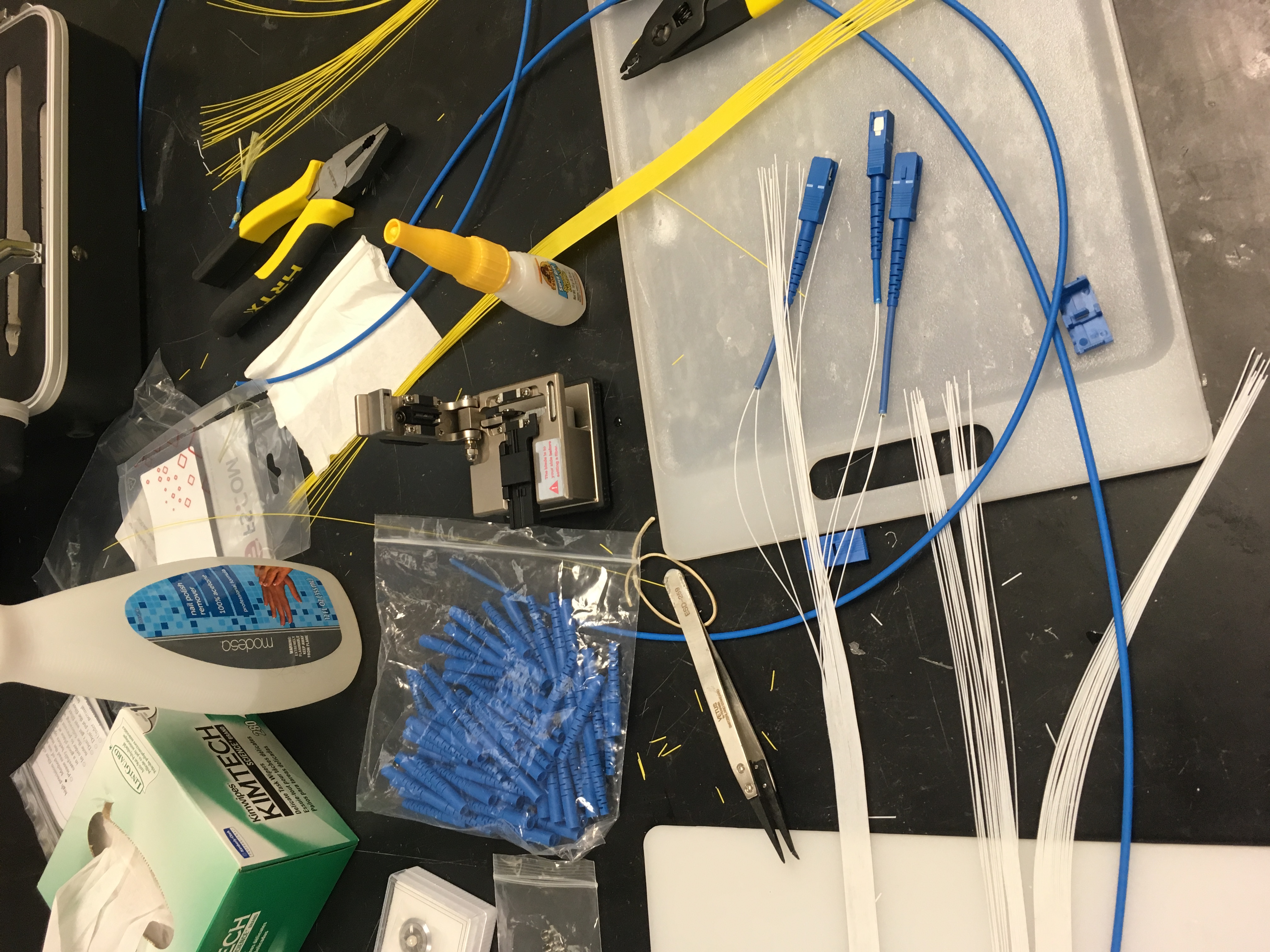 In this section, you can view images from my lab work in Dr. Carol Scarletts Laboratory from which I gained hands on experience with Florida Agricultural and Mechanical University Physics Research Department, the Center for Plasma Science and Technology (CePAST) in Innovation Park, Tallahassee. I was one of the students helping create attenuators with Fiber Optic Cables, and coming up with a feasible method to cleanly assemble devices. Process included trial and error to see best method to remove cladding without damaging the 50 micron sized glass.Originally, after taking the cables out of the blue jacket, I attempted to strip excess material with wire cutters. This method worked, but left a lot of cladding; and any attempts to apply pressure would result in loss of length from the glass cables. With my professor, Dr. Scarlett, we decided to use chemicals to finish removing glass cladding. Once we had enough, we laid the fiber optic cables side by side (21x21) to create a box; and connected them to the attenuators.